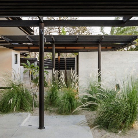Villa Monoi is a holiday home at the southern end of Playa Tamarindo located in the province of Guanacaste Costa Rica. This zone of Costa Rica belongs to an area of the most arid country affected by a pronounced dry season lasting one third of the year. The flora and fauna belong to the dry tropical forest and the region in general suffers from occasional droughts and water scarcity. The house is introverted since its location does not allow for the enjoyment of exterior views more than the groves of a green area contiguous to the property in the middle of a residential development.