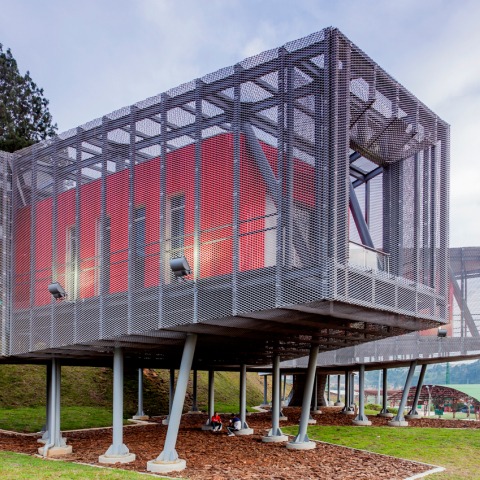 The structure is conceived as an insight skeleton that manages to be present without being intrusive, by creating color uniformity and a relationship between the skin and its frame all along the building. Both the facades and the lower and upper exterior planes are composed by prefabricated metal mesh panels attached to the building´s structure allowing for a quick and simple assemblage.