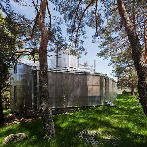 The facade consists of a triple skin: First there is a sandwich panel with OSB boards (which provide the interior finish), extruded polystyrene foam insulation and waterproof chipboard, surrounding the core of the house rooms and living spaces. The second skin is made of cellular polycarbonate, providing extra insulation and expanding the perimeter to wrap a south-facing greenhouse that collects heat during winter days and can be opened to the outside during the summer, defining semi-outdoor extension space for the house. Steel cables allow climbing plants to grow on three sides of the house, as a vegetal third skin.