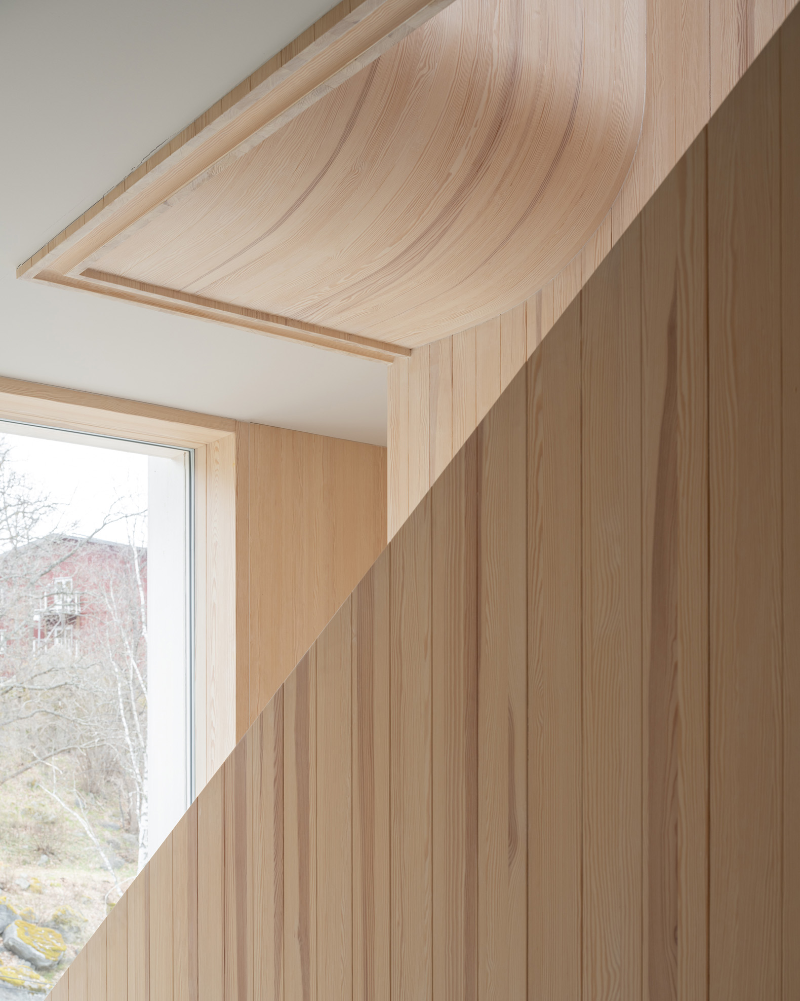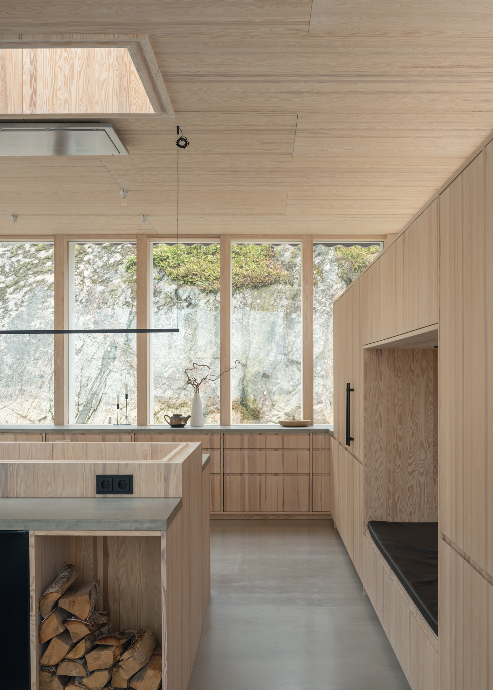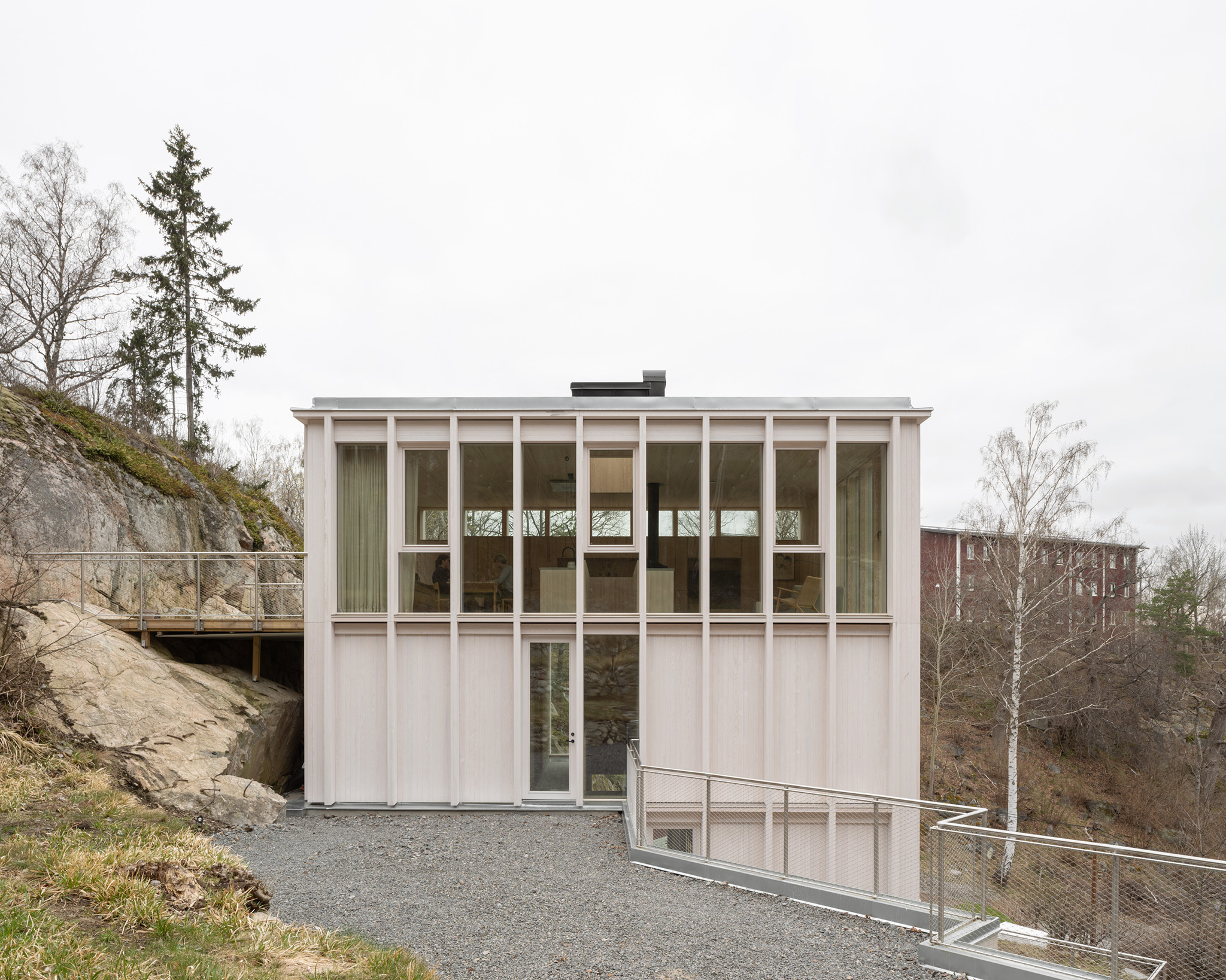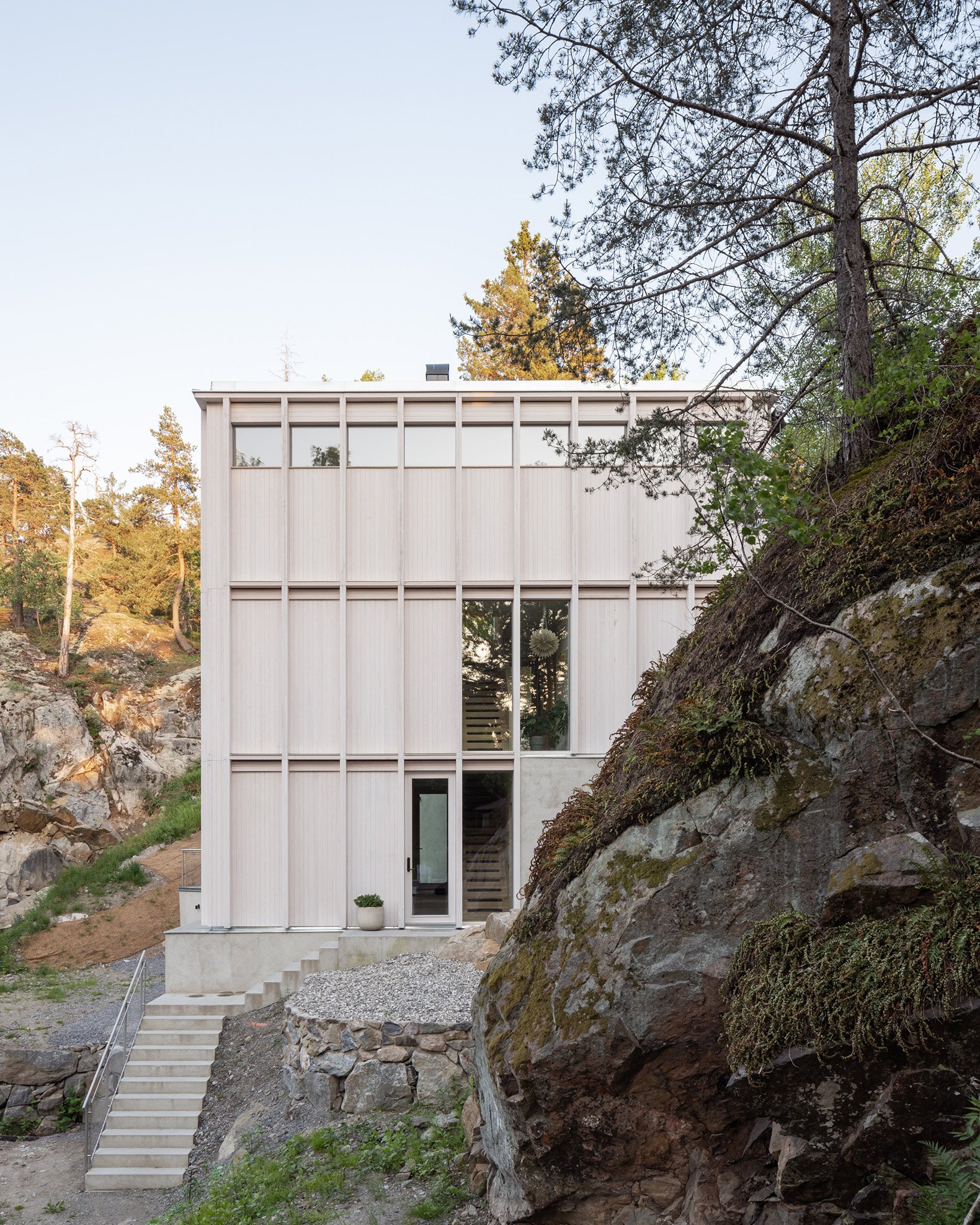 A central timber stair ties the three floors of the building together and organises the plan. The bottom floor of the building comprises utility spaces. The middle floor is serves as the main entrance floor, holding wardrobes and bedrooms. The fully glazed, open-plan top floor offers striking views of the Stockholm port inlet and is designed for a combined kitchen and living room. Each floor has direct access to different levels of the terraced rock garden outside.