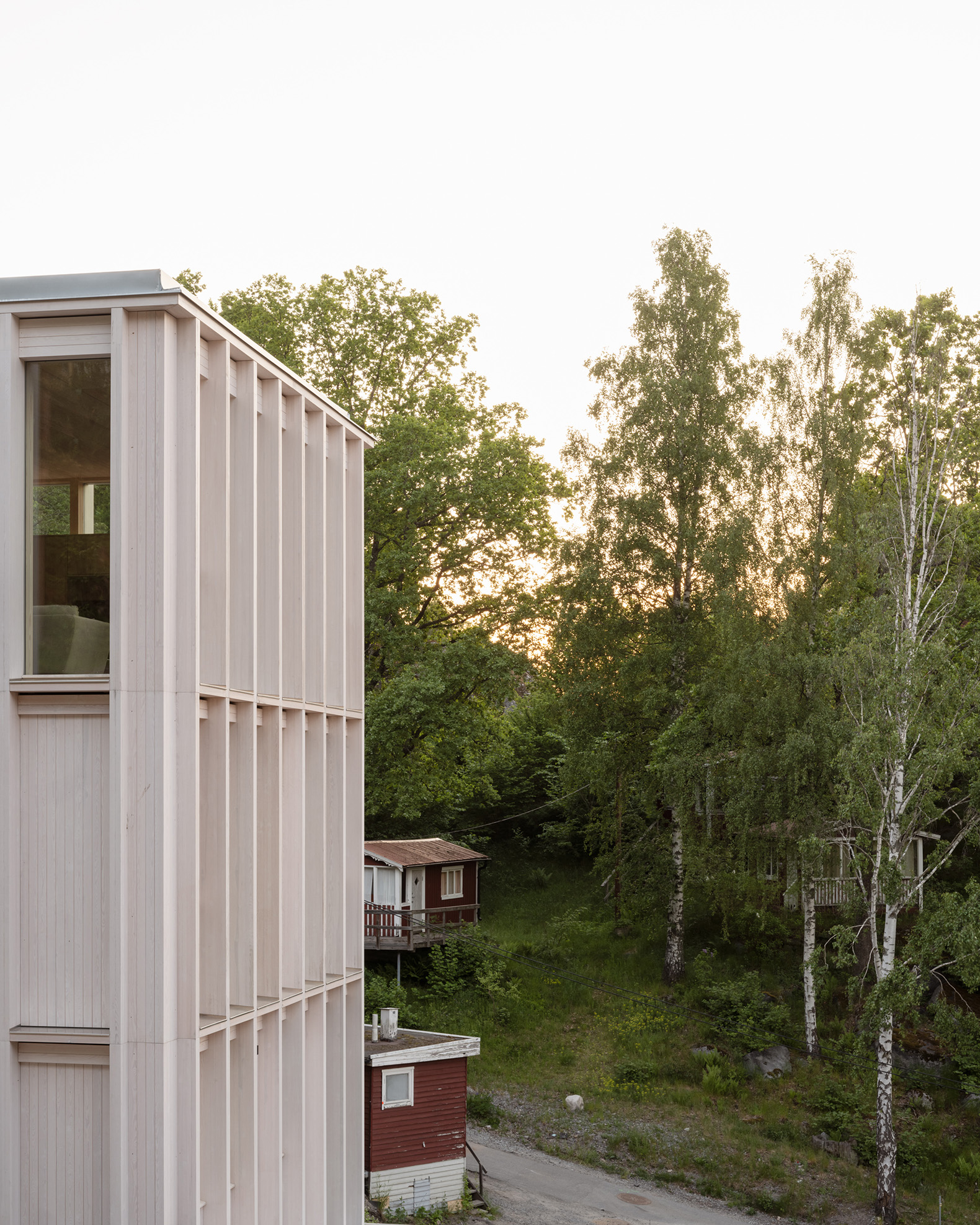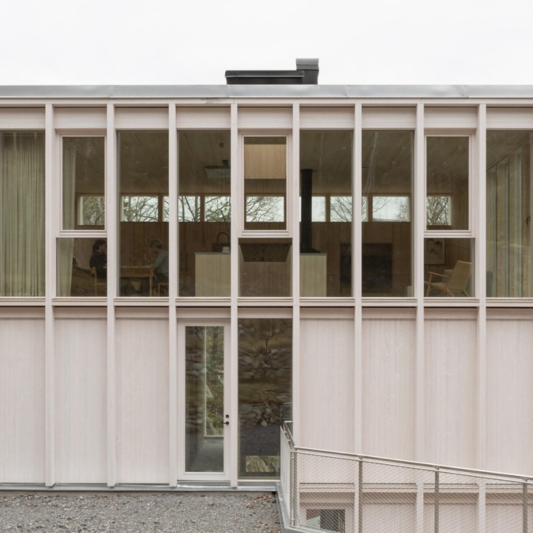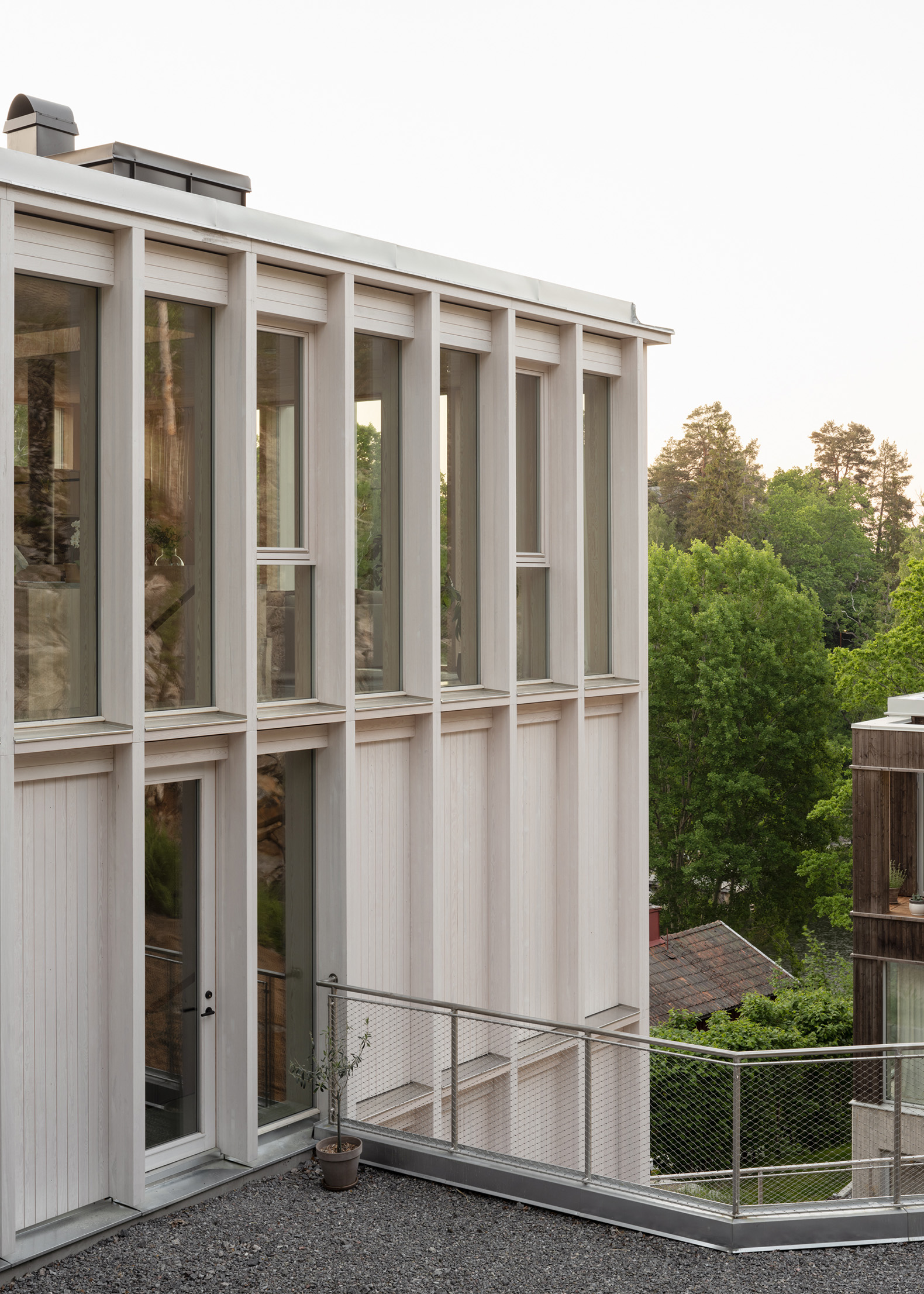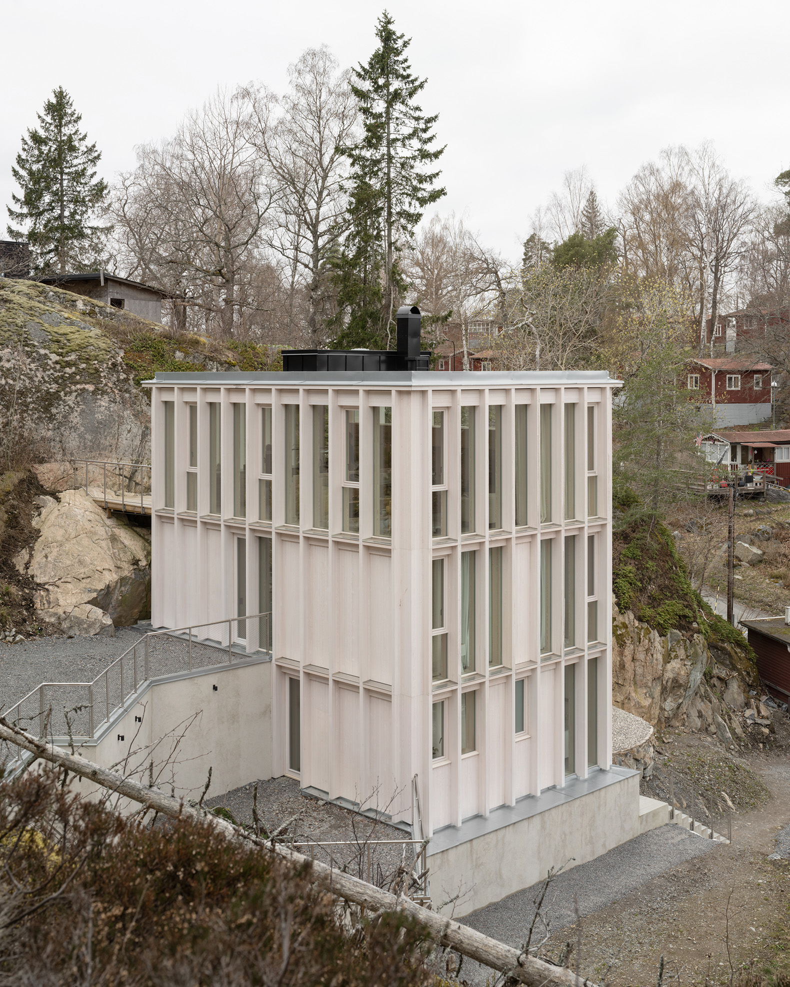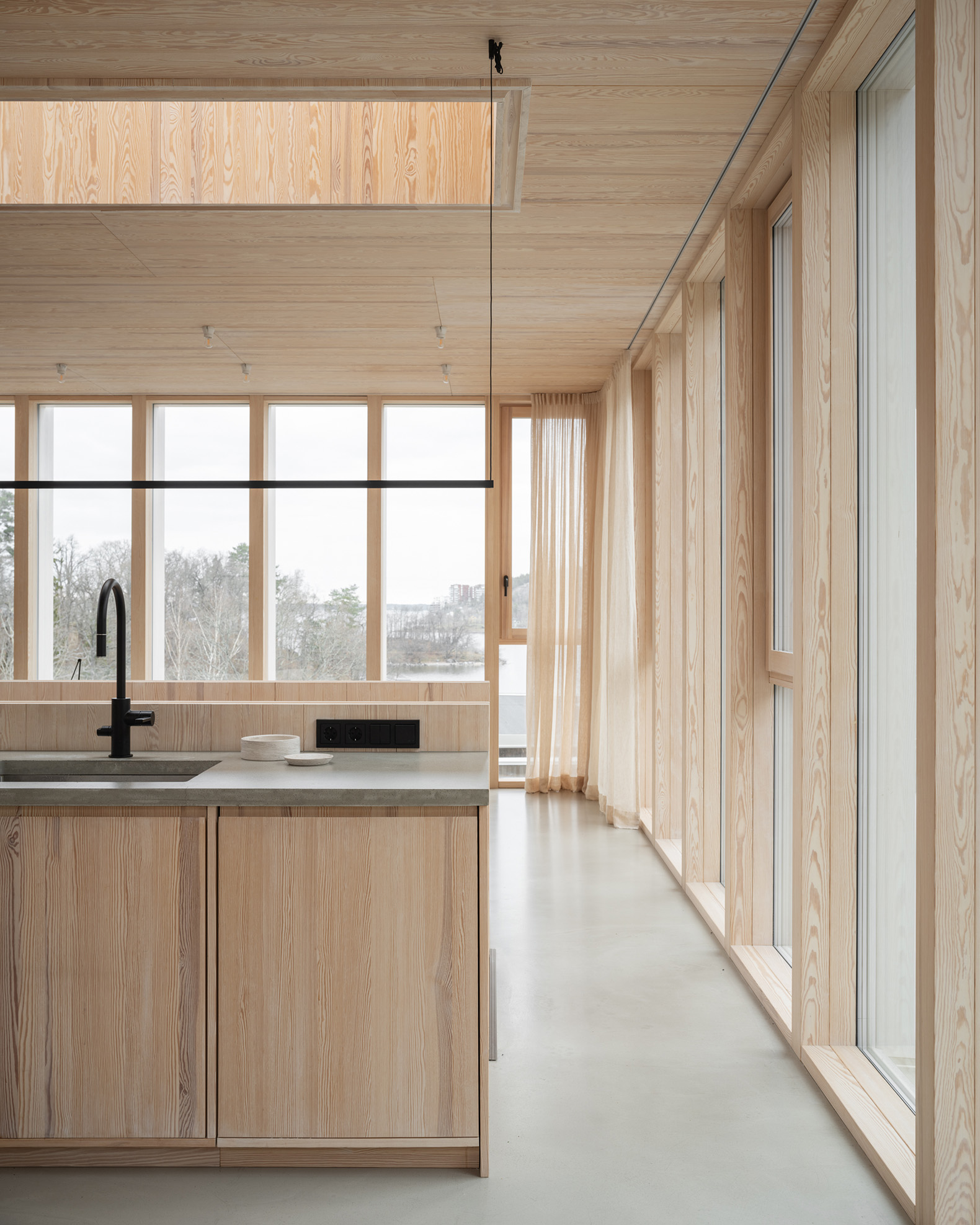 A central timber stair ties the three floors of the building together and organises the plan. The bottom floor of the building comprises utility spaces. The middle floor is serves as the main entrance floor, holding wardrobes and bedrooms. The fully glazed, open-plan top floor offers striking views of the Stockholm port inlet and is designed for a combined kitchen and living room. Each floor has direct access to different levels of the terraced rock garden outside.