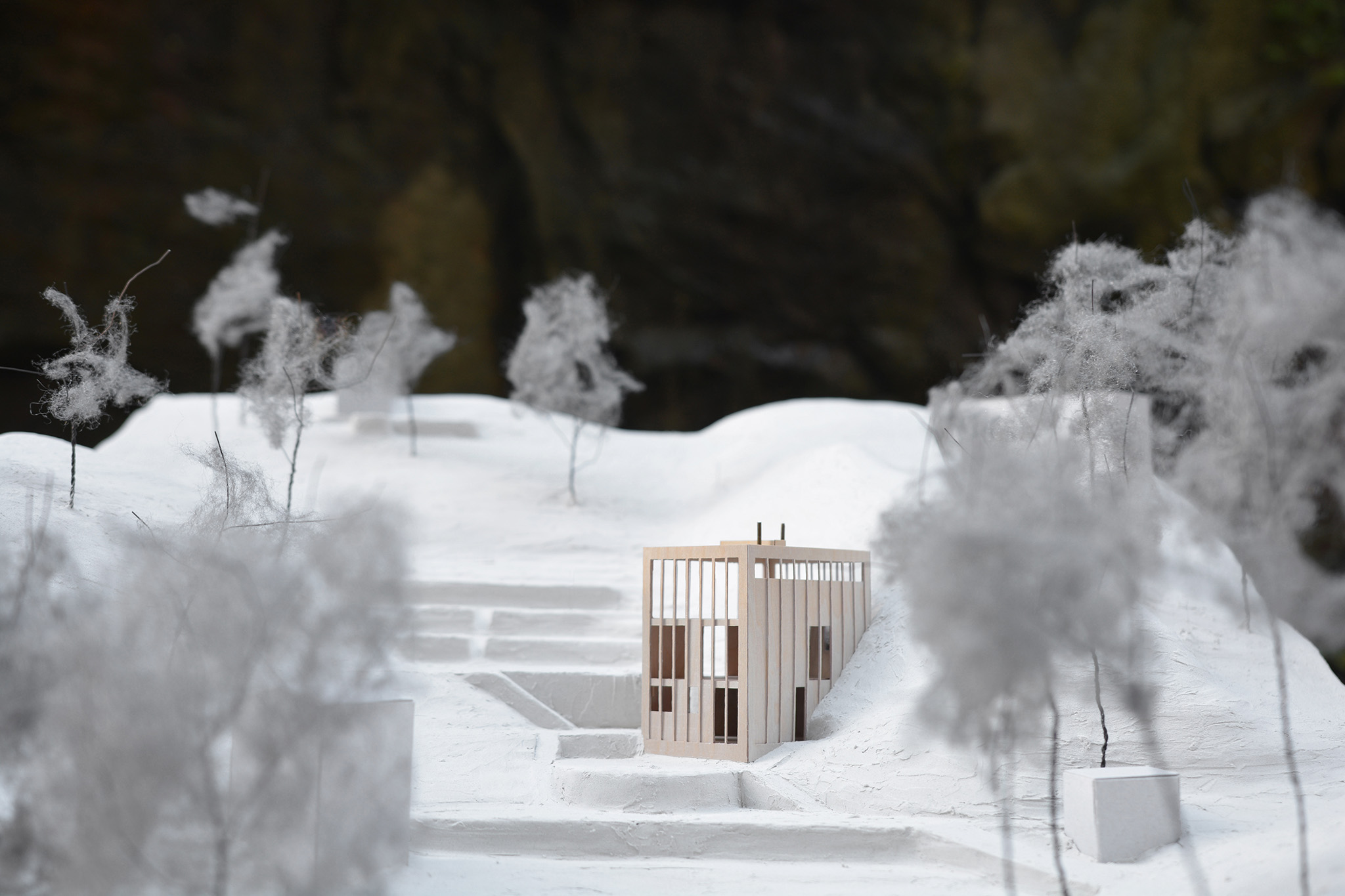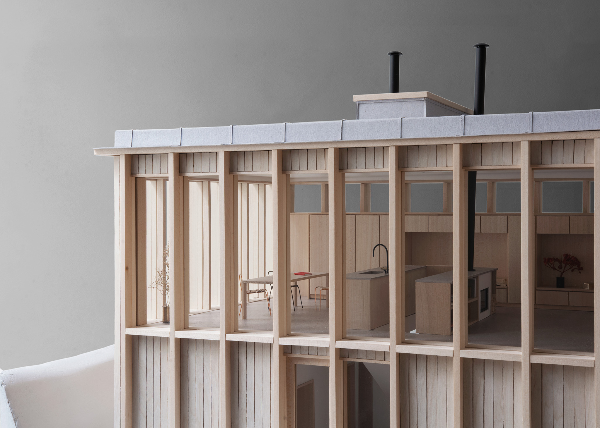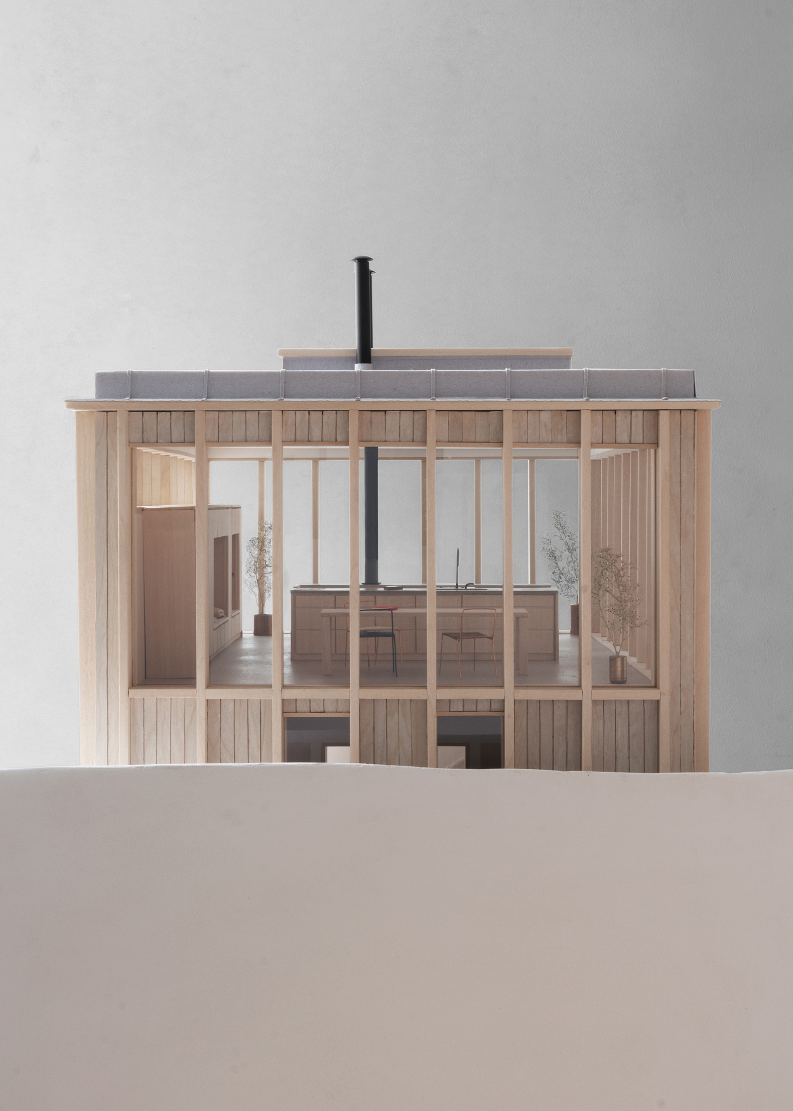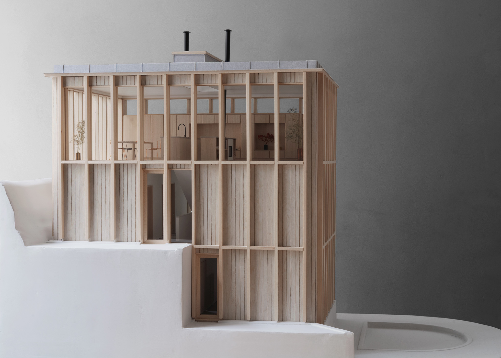 The building uses renewable materials where possible, given the particular characteristics of the site. Where the Saltviga project worked with ennobling off-cuts from floor production, in this project an idea of upgrading raw wood material was tested. Knotty pinewood was turned into knotless pinewood through a select-saw-glue process. The knotty wood was used for invisible interior structural parts, while the carefully selected flawless parts were exposed. As such, the pinewood was turned from an affordable and readily available material into one with more subtle and graceful textural qualities.