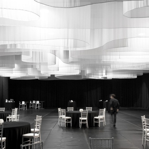 The cloud, in particular, is a large black velvet fabric that surrounds the entire sports hall, which helps to abstract space. The curtain makes a drawing that is labyrinthine that, together with the quality of the fabric, makes everything look like an enigmatic and mysterious sky.