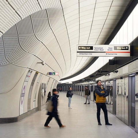 The line-wide design encompasses the platforms, passenger tunnels, escalators and station concourses, including signage, bespoke furniture, fittings, finishes, and technology creating a ‘family of elements’. Taking its cue from the engineering feat of the new line - the complexity and scale of the project - one of the defining features of the design is the treatment of the passenger tunnels and platforms.