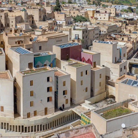 The project as a whole seeks to find a balance between the site’s many components the reprofiled river, the Bin Lamdoune Bridge (a symbolic link between the Qarawiyyin and Andalusian banks), the restored buildings, the new constructions, the alleys, and the squares all while preserving the historical fabric of the medina.