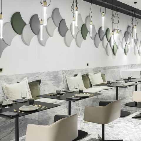 The restaurant is characterized as an interior garden, an integral part of the exterior, mirroring the same symbolism and balance, with the presence of vegetation that flows through the ceilings, in line with the various moments of artificial lighting with scenic effect, and the acoustic panels that, in addition to their primary function, assume the carp form: symbol of prosperity, longevity and fertility.