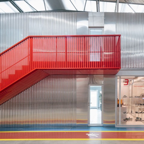 At a constructive level, we can highlight the metallic skin with different finishes and perforations, creating textures with different sheens on the continuous surface. To break the continuity of this surface, the studio has designed a diagonal staircase that crosses the side of the volume, painted in red, the company's corporate color.