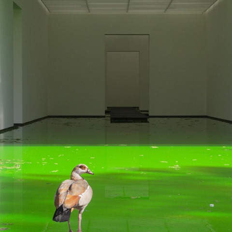 Eliasson removes a large section of the windows of the Fondation Beyeler and opens the museum to its surroundings. Visitors can navigate the waters, which are up to 80 cm deep, through a series of walkways that enter and exit the building. The exhibition was designed to receive not only human visitors, but also other beings (insects, bats or birds, for example) that can fly or temporarily settle within space.