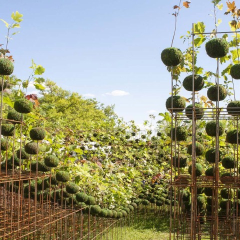 During their visit, guests have been welcomed to enter the micro-woodland and be surrounded by the levitating kokedamas: hundreds of seedlings proudly displaying their intimate relationship with soil supported by a 7.5 feet high three-dimensional metal structure. This assemblage has been woven with steel inviting the contradictory blend of strength and delicacy that is implicit in all living networks.