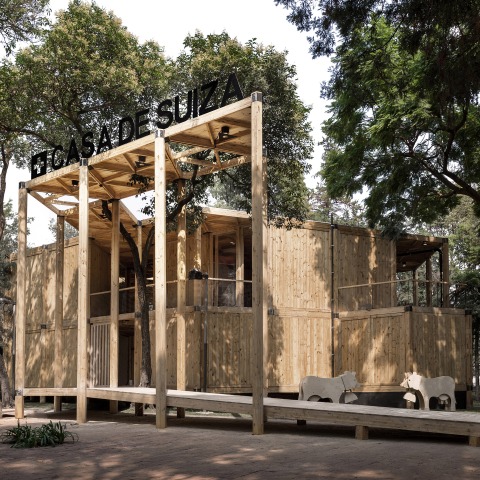 The design of Casa de Suiza abides to the materiality of the original House of Switzerland made entirely of wood, a traditional way of building in Switzerland. The pavilion is designed in modules made of certified pine wood and metal joints, promoting the use of wood as a structural material in Mexico. These modules are derived from the triangular grid, which guarantees and efficient assembly and disassembly of the structure on site. Prefabrication and assembly are carried out by the company “Metal y Madera”.