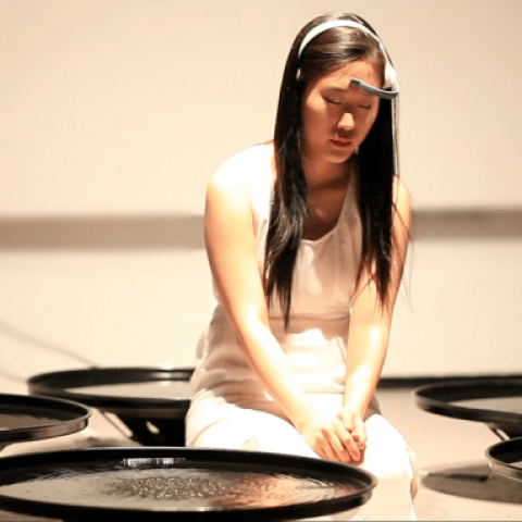 EEG sensor are brainwave detecting, and measures frequencies of brain activity (Alpha, Beta, Delta, Gamma, Theta) relating to the state of consciousness of artist Lisa Park while wearing it. The data collected from EEG is translated in realtime to modulate vibrations of sound with using software programs. EEG sends the information of her brain activity to Processing, which is linked with Max/MSP to receive data and generate sound from Reaktor.