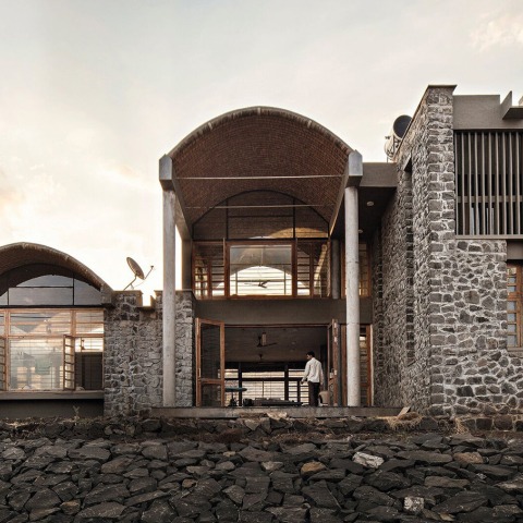 Natural basalt stone is chosen as the primary locally available building material and combined with handmade terracotta hollow tubes for vaulted roofs as already used in the Wall House. Apart from their main residences, the site includes collective shared buildings accommodating caretakers’ residences merged within the design of the compound wall in stone masonry and a cylindrical water tank, also in stone masonry.
