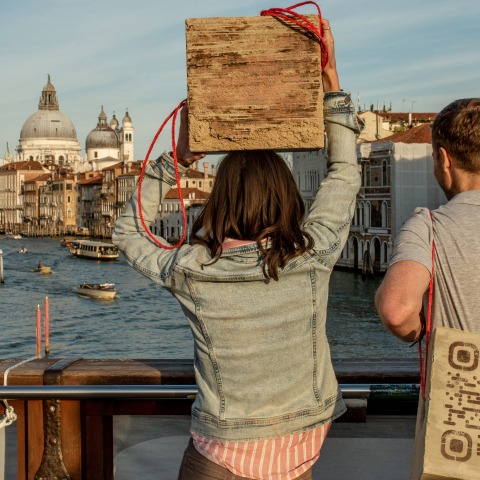 In March 2022, another opportunity for iteration arrived. In a tribute to adaptation, Exculpatio embraced change and focused on a performance to articulate the installation’s dual essence as a demonstration and a sculptural space, as well as, its bilocation in Italy and Switzerland. The 80 Pixels’ Performance has been a silent collective manifestation to bring awareness about the lack of substantial action against climate change: crowdsourced transportation where individuals carried ultralight concrete pixels in a poetic pilgrimage across Venice from April 14 to April 17. As the pilgrims were simultaneously creating the first impromptu pixel arrangement in Venice, the pixels were being virtually assembled into two rectangular monoliths three meters high in Switzerland.