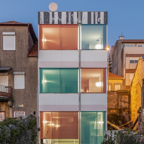 In an artery connecting the city centre to its suburbs, where individual houses are being demolished daily to leave place for bigger housing developments, conceiving a new individual house is a delicate task. The façades of the project stemmed from a rough conjugation of both building types, sitting in a fragile ambiguity. A rational order, following the logic of the plans, is superimposed with a set of seemingly inordinate elements: row windows, erratic marble frontons, seemingly arbitrary drainpipes and pink marble discs unbalancing the composition. The house is an exercise of uniqueness as much as it is an exercise of banality.