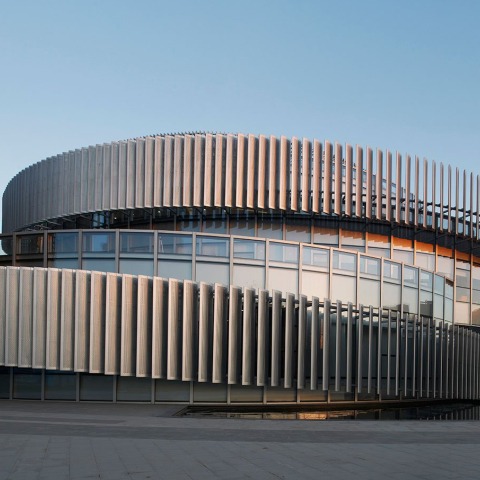 Under the backdrop of the large glass curtain walls, the shutter profiles made of metal aluminum panels make the exhibition center shows a stronger sense of technology. Each louver section is shuttle shaped, and perforated aluminum plate is used to make the entire building lighter, and different light and shade effects are produced with sunlight’s angles. Each shuttle louver is rotated 30 degrees in the direction of the spirals, cleverly concealing the lamp troughs at the ends, and the curved illuminated face gives the light a rhythmic beauty that enhances the overall flow of the building.