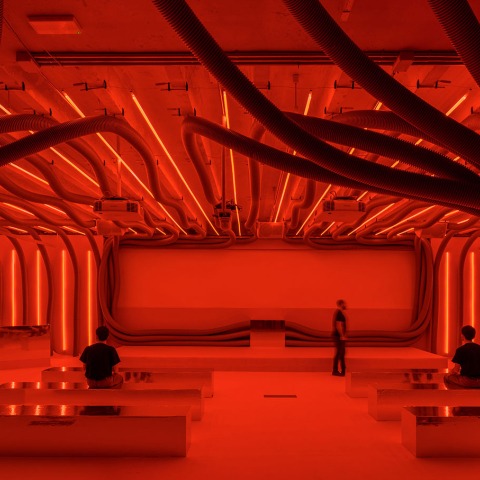 The language of excess, fluidity, connectivity, and transmission, are rendered in this space through the use of three materials: tubes, lights, and metal. Lining the walls, ceiling, and parts of the floor, visitors are immersed in the machine-like organs and red glow; all of which are familiar and at the same time alien.