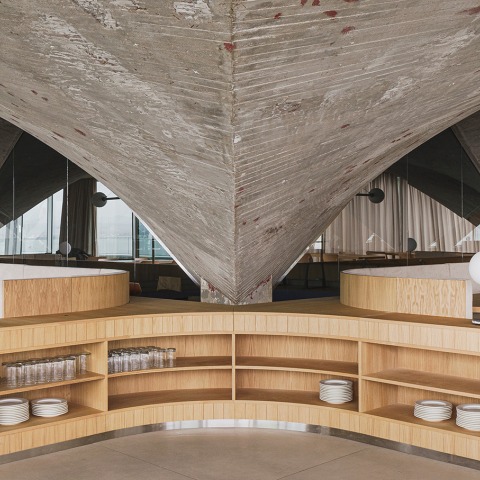 Geometry becomes the total protagonist of the restaurant's interior, treated as an artistic element framing with false triangular wooden ceilings. On the outside, immersion in the Cantabrian Sea is sought through a glass box with maximum transparency to add a total view of the landscape of the Bay of Santander.