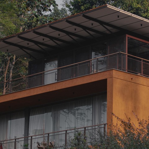 Urul, nestled amidst the serene landscapes of Wayanad, exemplifies the harmonious integration of architecture and nature. The two-bedroom residence, tailored for a nature-loving couple, offers an immersive experience, inviting the beauty of its surroundings into everyday life honoring nature's colors and elements. Positioned with a rocky hill as its backdrop, a panoramic view of Chembra Peak upfront, and the Indian Rosewood tree as a focal point, the house is carefully placed to blend with the terrain. Its cantilevered ground floor design minimizes disturbance to the earth below while also creating a sense of the balcony. The detail environmental study led to the identification of two paleochannels (ancient riverbeds) flowing underground respecting to which the well was placed.