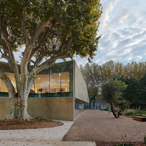 The town of Pélissanne is an ancient fortified city located in the heart of Provence in France. The new media library takes place in the historic Maureau Mansion, built in 1642 and set in the heart of an urban garden. The building is thus part of a rich landscape and heritage context. The project dialogues between two eras and two dimensions: the verticality of the rehabilitated volume of the existing building and the horizontality of the extension. This dialogue is embodied in the contrast between the apparent homogeneity of the facades and the different shades of local materials used, such as ocher and Rognes stone.