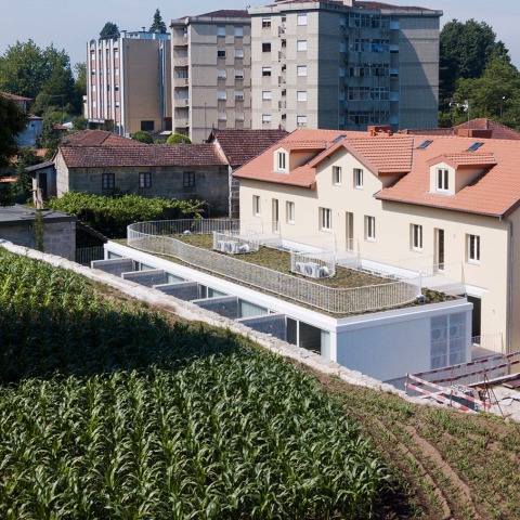 This extension of the old building allowed the creation of a large green collective outdoors space, that blends the new construction with the existent agriculture slope. In this new wing of the building, several patios make the connection between the two constructions and enable the light and ventilation to enter the apartments.