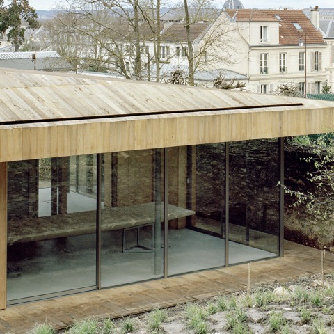 The centrepiece of the project, the wooden roof, establishes a dialogue with the morphology of the adjacent building, and at the same time stands out from the other roofs in the city of Versailles. The pavilion uses bio-based materials for its construction, ranging from the roof and façade cladding, made from wood from the Versailles national forest, to the bio-based insulation and biomass heating system, which provide thermal comfort to the building.
