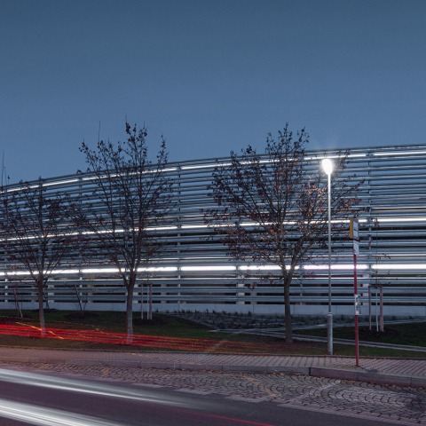 The LED lighting placed on the barriers of the northern facade refers to the long exposure car passage. The pond in front of the parking house collects rainwater and thus helps retention to utilize water. The three roofs at the highest level of the building are covered with vegetation. The whole building should drown in the green in the future.