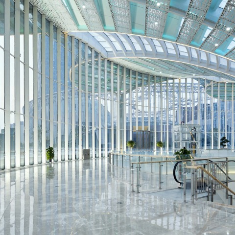 The facade of the entrance hall is formed by glass curtain walls with concealed frames. With reference to the curtain wall design of the Grand Theatre of Zaozhuang Cultural Center, it uses vertical steel ribs as the main supporting structures for the curtain wall. Those vertical ribs are combined with cables to form a point-fixing glazing curtain wall. The transparency of the glass wall enables people who are standing outside the building to perceive the pomegranate-flower image from all directions.