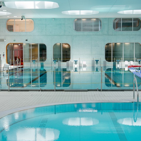 The development of the spaces gives priority to transparency and the depth of field associated with very good use of daylight. All the facades are open and accessible, and the various elements of the programme are organised in the form of light, coloured, rounded bubbles, floating on the project’s spatial continuum. Our design scheme emphasizes the roof as a determinant element of the Fort swimming pool providing a solarium that is accessible via an indoor-outdoor ramp that runs along the swimming pools hall and provides access to the fifth facade.