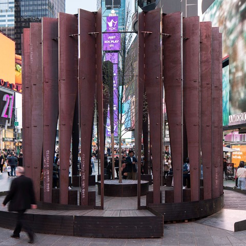 Created for Design Pavilion and the NYCxDesign Festival, FILTER carves out space for quiet recentering within the frenetic energy of Times Square. Designed as both a monumental object and an ephemeral experience, the pavilion establishes a new node in the heart of New York City’s urban fabric – reorienting that experience toward the natural, rather than the man-made. Evoking the rugged Wyoming landscape from which it originates, FILTER draws the visitor into an engagement of its flowing folds of weathered steel and timber. At the pavilion’s center, a lone tree embodies the ecological cycles and serves as a counterpoint to the Manhattan’s urbanity.