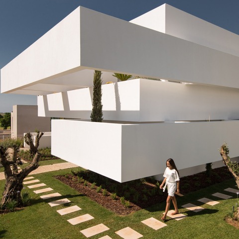 Five white terraces are stacked to allow us to move vertically and experience these different scales of the surrounding landscape. The voids between them create space for human and vegetal occupation, constantly hidden or revealed, formalizing the illusion of an interior garden or an exterior house.