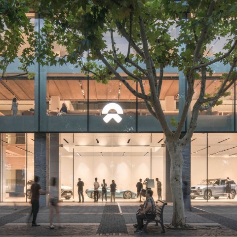 The sky over West Lake is applied to the upper levels of the building as a mirrored glass façade. By day, the façade changes with the movement of the sun, clouds and trees. By night, the building comes alive with different clusters of light and the activities within. By setting a fully mirrored glass façade in front of the columns, the image of a clean, contemporary object is revealed, evoking the feeling of a large-scale contemporary art installation. The full wall of windows displaying NIO’s newest car models inside, draw in passers-by with its open, inviting quality. The ground floor is home to the Discover NIO area where the water of West Lake inspired the fluid effect of the ceiling.