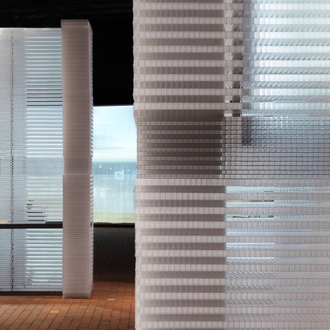 However made of temporary and low cost material, different routes through the pavilion offer a powerful sensory experience. The semitransparent walls are made by stacking simple plastic sheets in an inventive way, creating a kaleidoscopic effect when passing by. The clever engineering made sure that after the event the walls are completely demountable and reusable.