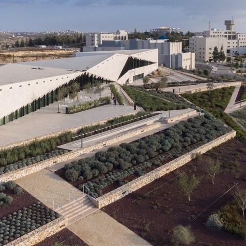 The building itself emerges from the landscape to create a strong profile for the hilltop both integrated into the landscape yet creating an assertive form that has a distinctive identity. Largely single-storey; it stretches out along the hilltop from the south to north; overlooking the gardens to the west. The ground floor, comprising entrance reception, museum administration, galleries, screening room and cafe opens out directly to the gardens at its northern end, while overlooking a stone amphiteatre below it at the southern end. In the lower ground floor there is a public Education and Research Centre with classrooms, workshops and administrative spaces. The education centre opens out to a cut stone amphiteatre to the west. In addition to the Education and Research Centre, the main art collections spaces, photographic archives, and art handling are all located in the lower ground floor. These spaces are not accessible to the public; they open out to a secure delivery yard at the eastern side of the building. The building will be the first LEED Certified building in Palestine.