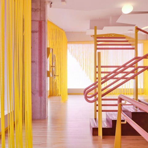In the East part of the clinic is placed the rehabilitation gym (dominated by pink shades, that help increase the melatonin therefore the ailments of the patients decrease) with yellow filters that provide sitting areas in front of the large windows (mainly North oriented) where the patient can rest or wait to be attended.