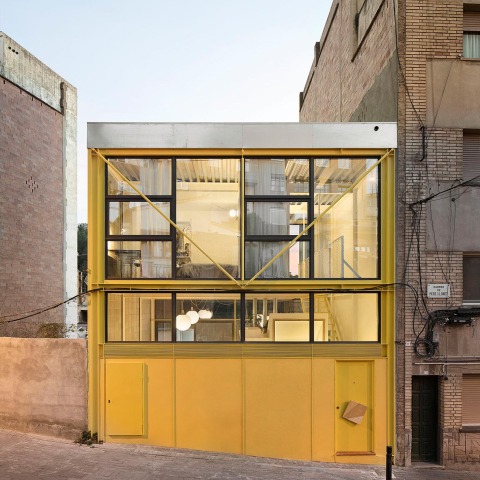 The house aims to frame and close off a piece of air in this area in Barcelona and emphasizes its main construction elements. A heavy plinth is built, in relation to the garden and the earth, on which rests a light metal framework structure open to the landscape and the Sun.