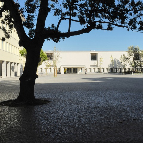 For the outdoor areas, of unusually generous dimensions, the project underlines the continuity of the vegetation of the fields through new plantations, in order to emphasize the sense of the site as a public garden. The staircase that we designed, opening an existing cul-de-sac to connect the central patio to the old Patio das Caravelas situated on the top platform, as well as the direct connection created between the new library and the sports fields across the covered playground, are both transformations that help to emphasize the sense of the whole as a public garden and profoundly shape the daily living in the school.