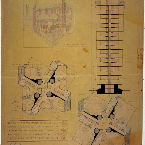 In the 50s, Wright exaggerated increasingly the formal aspect of his buildings. His last projects were: the unitary church of Madison (1945-1951), the synagogue of Beth Sholom in Alkins Park, Pennsylvania (1953-1959), the Annunciation Church in Wauwatosa, Wisconsin (1955-1961) and the Martin County’s civic centre in San Rafael, California (1957-1962).