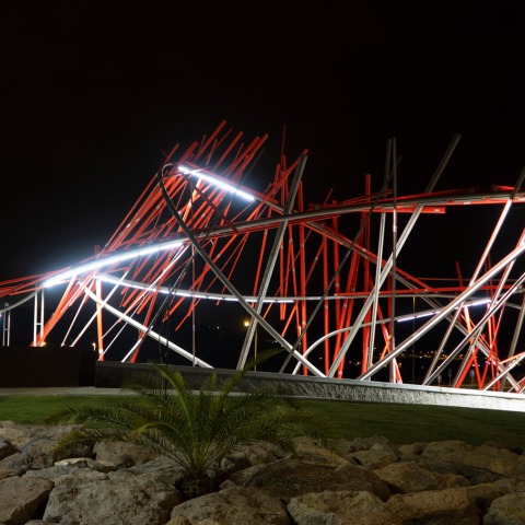 The work of Juan E. Correa shines with its light. It is not, although to some it may seem like, a huge "lamp", but rather a space articulated in such a way that it constantly changes its appearance: we have to go through it, follow different paths to understand how it offers us different and fascinating points of view. The sculptural element itself establishes an air circulation that dialogues and integrates with the architectural and landscaping elements. But, also, when night falls, the lighting (integrated into the sculpture itself) generates another prodigious dynamic. It will be the viewer or, better, the citizen who ends up finding different sites in that wonderful place that this work of public art provides. Although the symbolic key is (fortunately) open in this intervention, we could suggest that all those inclined or angular elements that (apparently) support and make up the piece may refer to the "unstable" equilibrium situation in which we live, but also to the need to support each other to make existence bearable. The fall is not allegorized but, on the contrary, a space of the common is built in which it is necessary to have open perspectives, different points of view that, besides, always respect the difference.