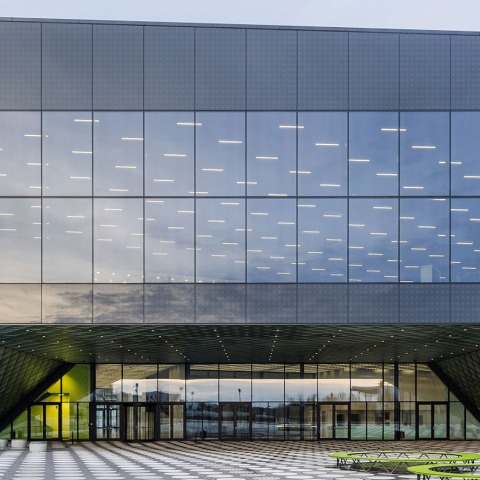 The façade is made up of a reticular grid of shimmering diamond shaped panels. Under the constantly shifting lighting conditions they generate an ever-changing cloud image.
