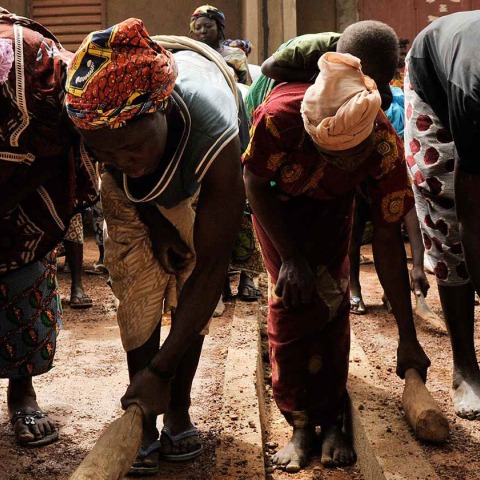 The culmination of the building work is the tamping of the clay floor to create a smooth, homogeneous surface. The enthusiastic involvement of the people of Gando was the key to the success of this project. Everyone gained not only new skills but also a sense of responsibility, awareness and sensitivity to both the traditional and the innovative aspects of building.