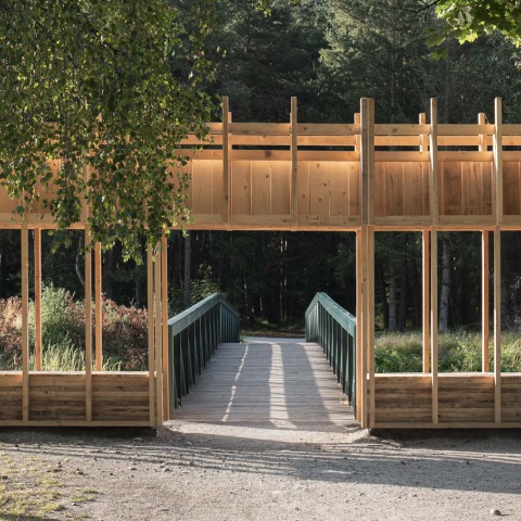 The structure, made from local pine, is composed of an assembly of vertical porticos, emphasizing the graceful, infinite slenderness of the trees. This bare, radical framework evokes a levitating volume.