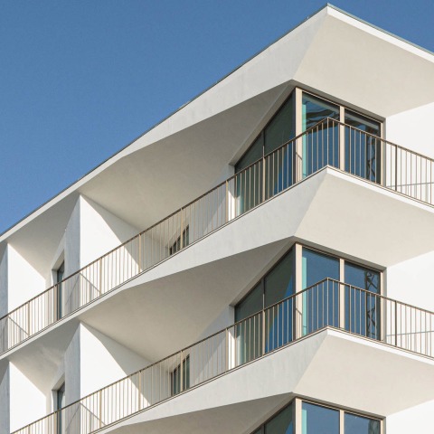This building is located in the city of Porto, Portugal, in a residential area close to the city center. The construction stands out for its contemporary forms, whose distinct composition results from the morphology of the lot, allowing the exploration of full and empty forms that create divisions between balconies. To ensure harmony with the surroundings and balance its distinctive design, the building's materials and colors were chosen for their simplicity and sobriety, with the aim of diverting the observer's attention to the formal dynamics created by its shape. At night, these forms are highlighted by carefully studied lighting that precisely reinforces the irregularities that characterize the facade.