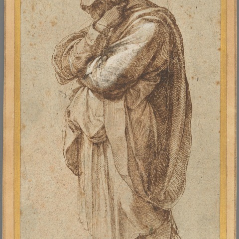 Michelangelo’s powerful pen and ink study of a mourning woman exemplifies his extraordinary talent for monumental figural conceptions. It is characterized by dense hatching and crosshatching in brown ink, with highlights of white lead. The figure is seen in profile and dressed in a full-length robe worn by women of antiquity as depicted in Renaissance painting. Her pose and attitude reflect the mourning figures often found in paintings of Christ’s deposition from the cross or a lamentation.