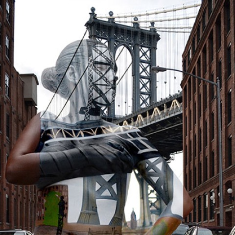 For inhabitants of large cities is easy to feel than are invisible, and Trina Merry used this idea literally to develop her work. Using the technique of bodypainting, to transform models topless in landscapes of the Big Apple. Only the use of brightly colored sneakers draw attention to the images that make up the bodies with the Guggenheim Museum or the Manhattan bridge.