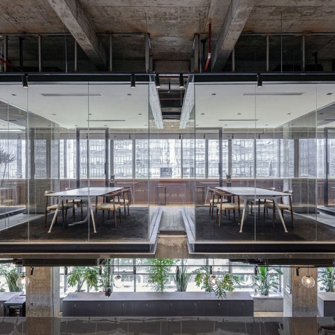 Above the public space, there is a large opening that rises the two floors of the building, and in which we find suspended glass "boxes" that function as meeting rooms, the workspaces are hidden from the public, but with the same system of glass "boxes" that create a sense of spaciousness.