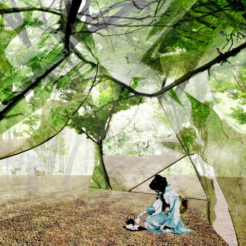 We looked to the spaces in a forrest to find intangible shapes of spaces that could give a structure to the mysterious fluid nature of glass. By framing these forrest voids with glass we found an interesting little house of trees interwoven by curved glass. A pavilion as a spacious glass imprint of the gap between some trees.