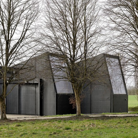 The walls and roofs are made of prefabricated wood-framed caissons fixed to a reinforced concrete slab and covered with a waterproof black rubber membrane. This uniform matt black skin transforms the building into a shadow, making it disappear into its environment like a building not meant to be seen; only used. The structure is pared down to its barest essentials — in this case referring to an ultimate site for creative practice.