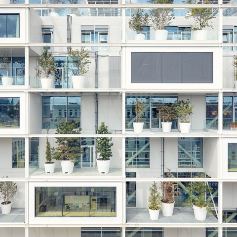 The building’s external shell recalls a set of shelves. This about 4.5-metre-deep, shelf-like zone runs around the building and provides shade. It allows spaces to expand, and provides room for terraces and greenery, as well as for servant elements like lifts, escapes stairs and building services.