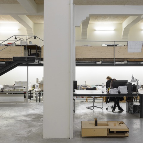 The project consisted mainly in the opening of the former large windows facing the courtyard and in introducing the infrastructural system in the old warehouse to allow its use as an architectural studio, but then hiding the intrusive presence of technology, leaving the room in its foundational matrix. Opposed to the concrete floor, the presence of the wood in accoustic panels, shelves and partitions reclaims the memory of the old carpentry workshop that worked in space.