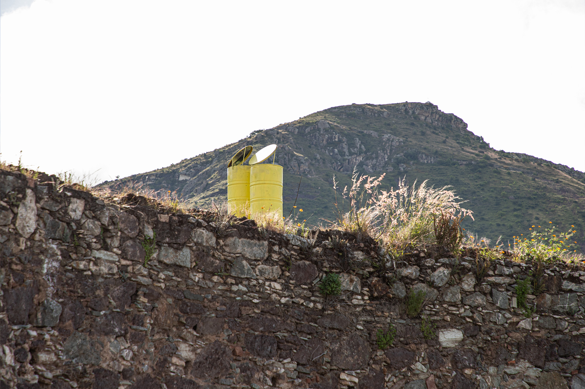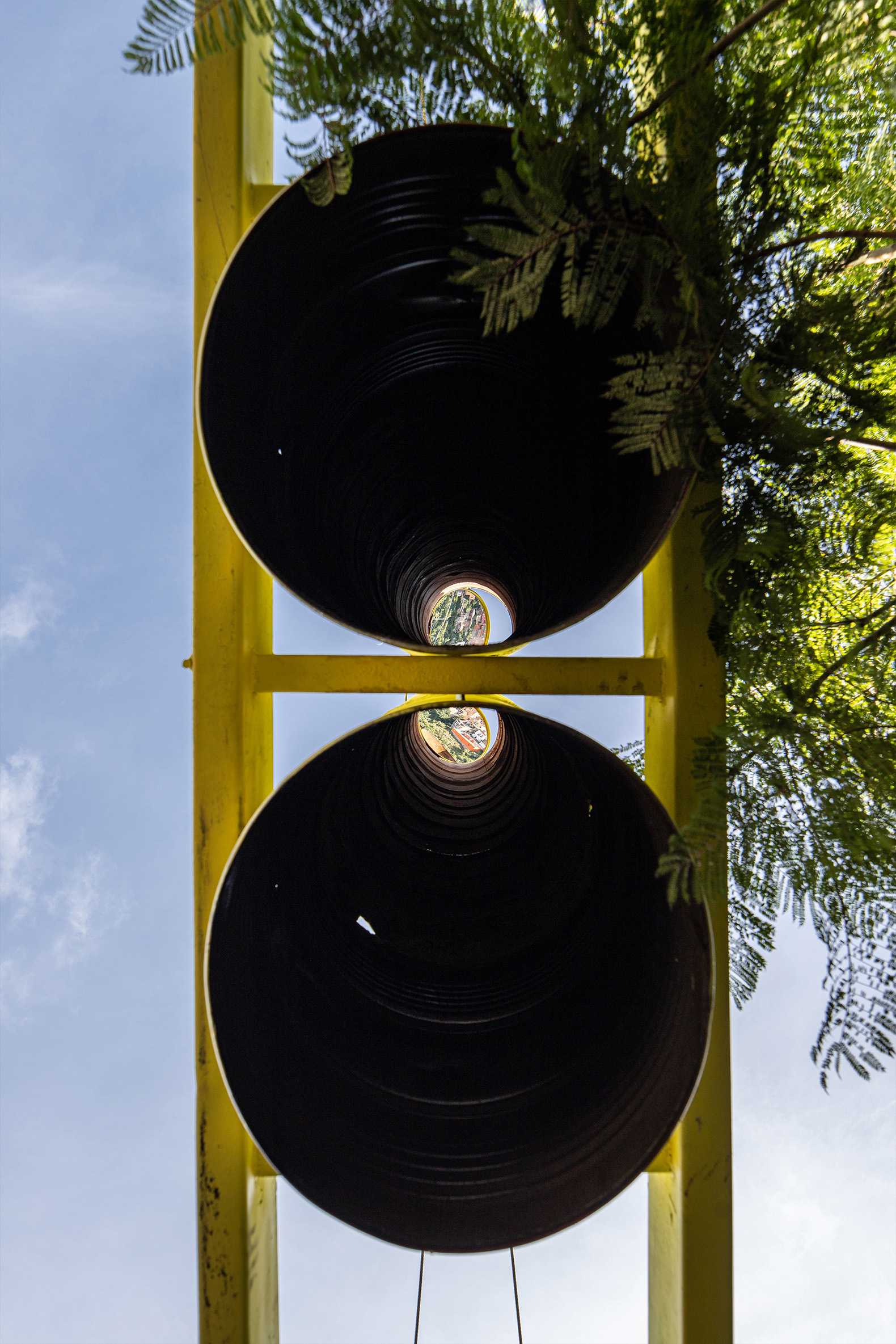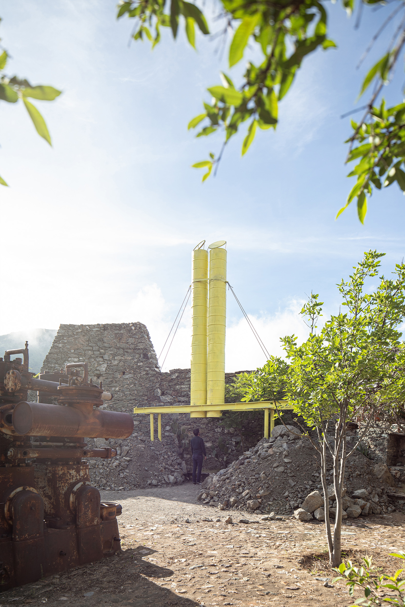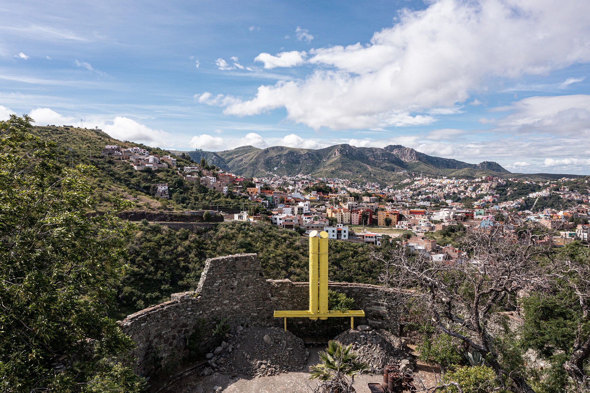 Through these visual devices, the yellow cylinders act as a "Trojan horse," capturing attention and drawing people into an interactive experience. When looking through the telescopes, the city of Guanajuato is reflected in mirrors placed at the top, offering an opportunity to understand the close relationship between the city and its mining history. Built from recycled materials, these devices are supported on piles of waste extracted from depths of 400 meters, reminding us that mining not only exploited the land but also shaped its urban fabric.